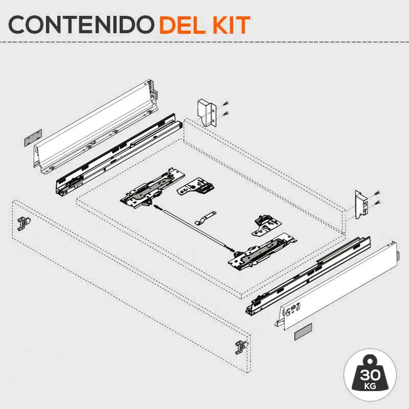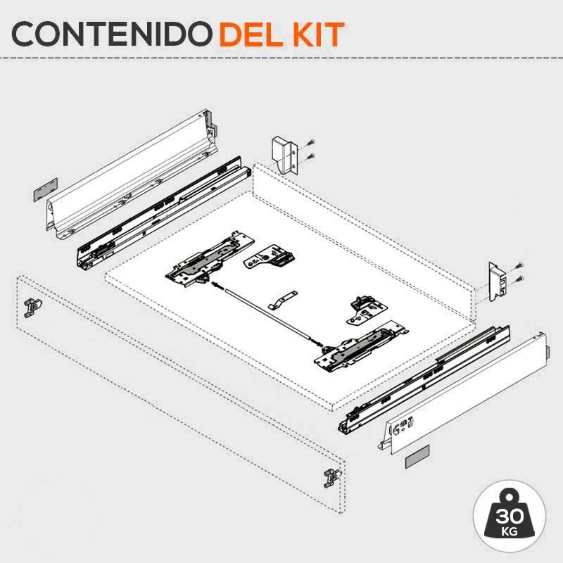 Tiroir de cuisine Blum Antaro avec système à BASCULE et système BLUMOTION conçu pour les façades de tiroirs sans poignée et pour une charge maximale de 30 kg.Appuyez simplement légèrement sur le devant vers l'intérieur pour l'ouvrir. De plus, avec le système de guidage BLUMOTION, un glissement doux et léger du tiroir est obtenu à la fois en ouverture et en fermeture tout au long de la vie du meuble.