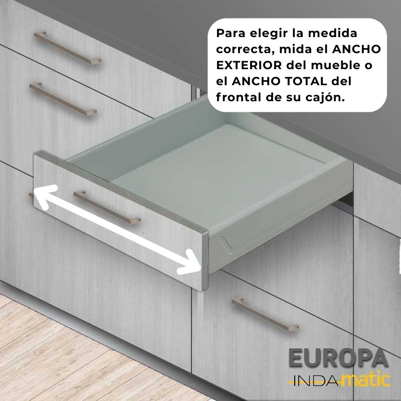 Développez Tiroir de cuisine Indaux Europe fabriqués en PVC injecté de couleur gris (RAL 7040) avec coulisses standard pour fond de 50 cm et extraction partielle.
