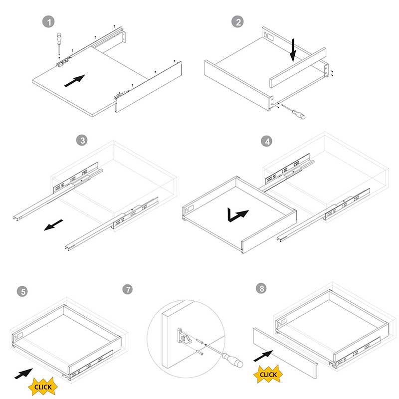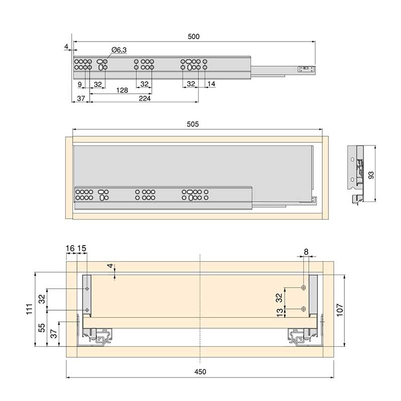 Le kit de tiroir Sommet de Emuca est fourni avec guides en acier standard de mesure de 50 cm de bas, de côté, de côté 93 mm de hauteur, d'anthracite et de base et à l'arrière de la mélamine de 16 mm d'épaisseur, gris anthracite avec une finition rugueuse pour une meilleure résistance de la surface.